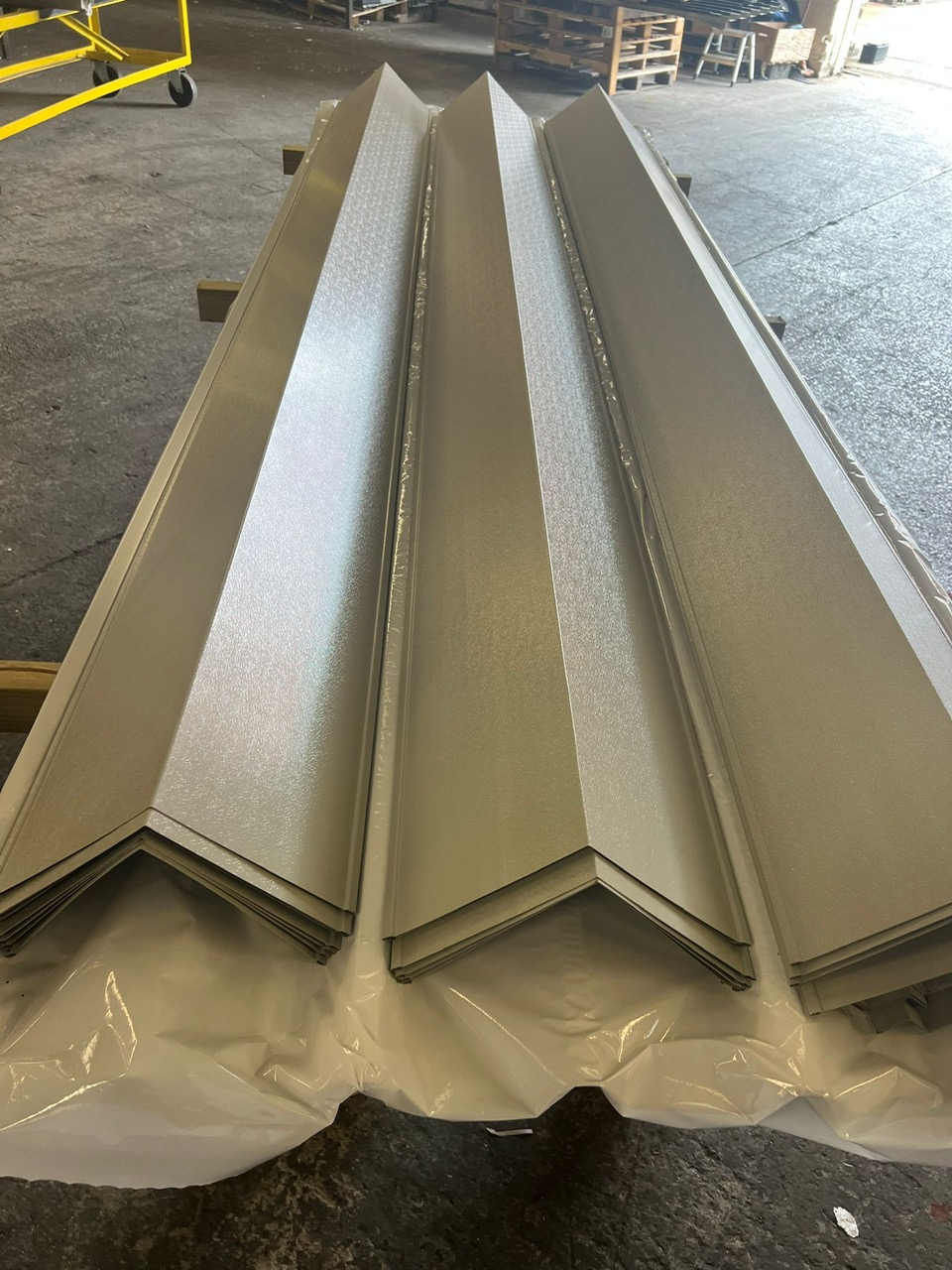 Flashings and trims are a great way to finish off your roofing project, they deliver a quality finish on the corners and ridges of your roof, ensuring that you have a watertight roof allowing any rain water to run down the facia. Generally, an externally finished ridge flashing is used at the Apex of a roof to bridge the gap and a form a cover between the two roof slopes, enhancing the robustness of your roof and providing a better finish. At Rollaclad, we can provide you with stock ridges to suit our stock roofing sheets, which are generally folded to 130 degrees with a standard a 3 metre in length.